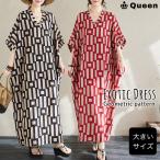 店舗名(大きいサイズのレディース服&下着専門店Queen)ロングワンピース 大きいサイズ レディース マキシワンピ 幾何学ボーダー柄 半袖 ポンチョ Vネック 夏 LL 3L 4L 5L 6L ブラック レッド