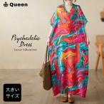 店舗名(大きいサイズのレディース服&下着専門店Queen)ロングワンピース 大きいサイズ レディース マキシワンピ ペイント柄 半袖 ポンチョ Vネック 夏 LL 3L 4L 5L 6L オレンジ